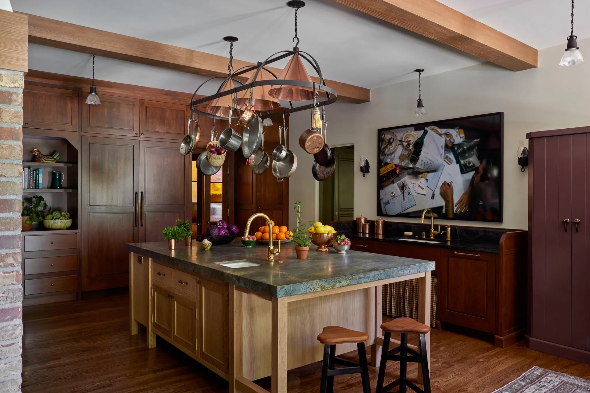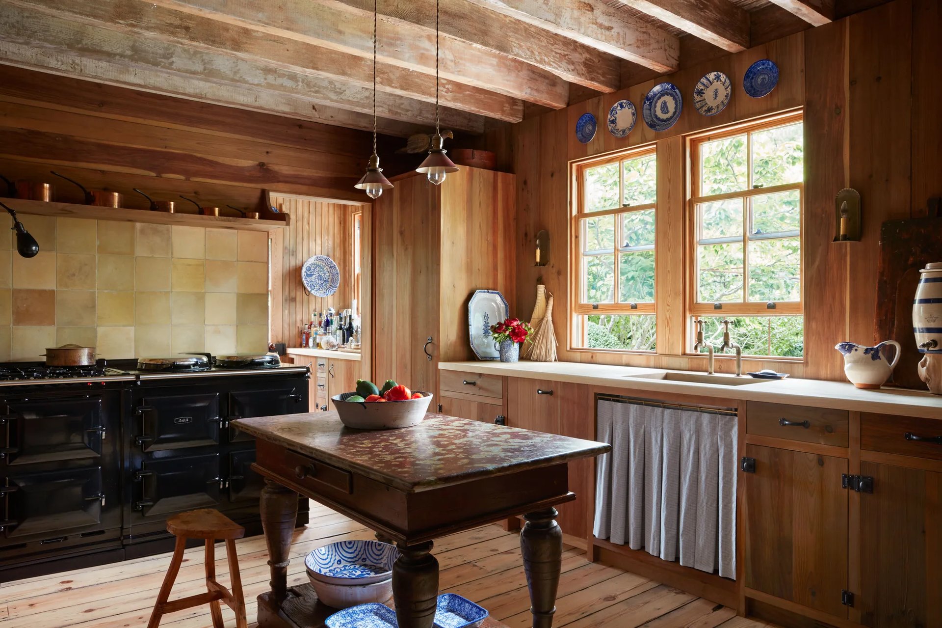 The kitchen of a fantasy-inspired Pasadena Tudor by Reath Design for actors Simon Helberg and Jocelyn Towne.